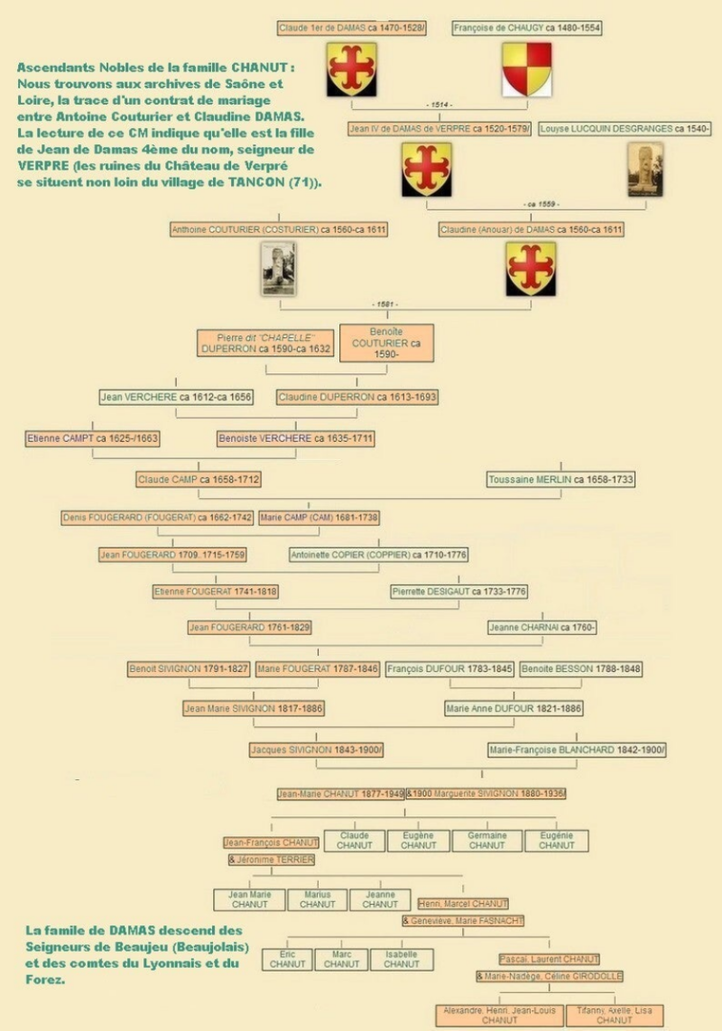 Par un Contrat de mariage du 5 mai 1581 qui a été établi à Tancon en Saône et Loire, dans le Charollais, la famille Chanut (celle de mes petits-enfants Alexandre et Tiffany) trouve une première ascendance noble.